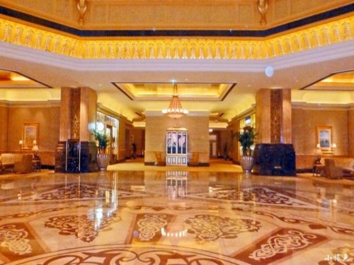 该酒店耗资近30亿美元,坐拥85公顷园林和1.3公里黄金海岸,是一座古典式的阿拉伯皇宫式建筑。酒店的外形仿佛是一座水上清真寺,有着浓郁的中东风情。其内部更是金碧辉煌。据说耗尽22吨纯金打造,更有海量的大理石、价值不菲的油画装饰和上千盏特别定制的施华洛世奇水晶吊灯……据说,有10名工作人员专职保持其清洁。